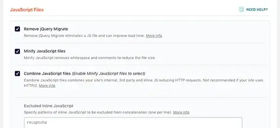 - Then, check the boxes Remove JQuerry Migrate, Minify JavaScript Files, and Combine JavaScript Files options.